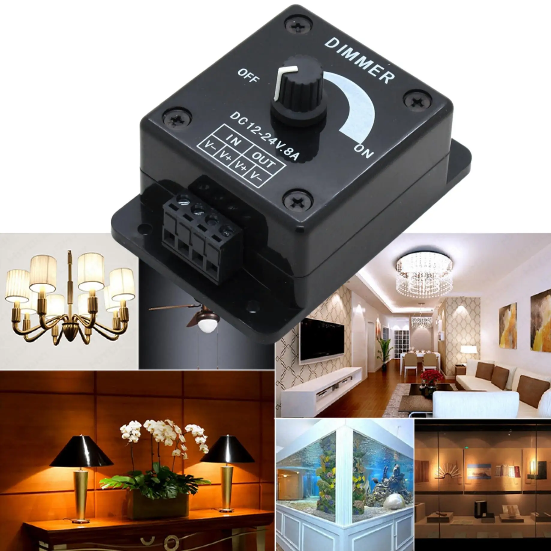 Dimmer é um controlador que ajusta o brilho da luz infinitamente, seu modo de controle é por potencial, você pode ajustar a potência da luz com o brilho mais adequado de acordo com sua necessa real. Ajuste a luz suave e estável, sem cintilação. Você pode usar também com ferramentos de 12v <96w ou 24v <192w para controlar o giro.