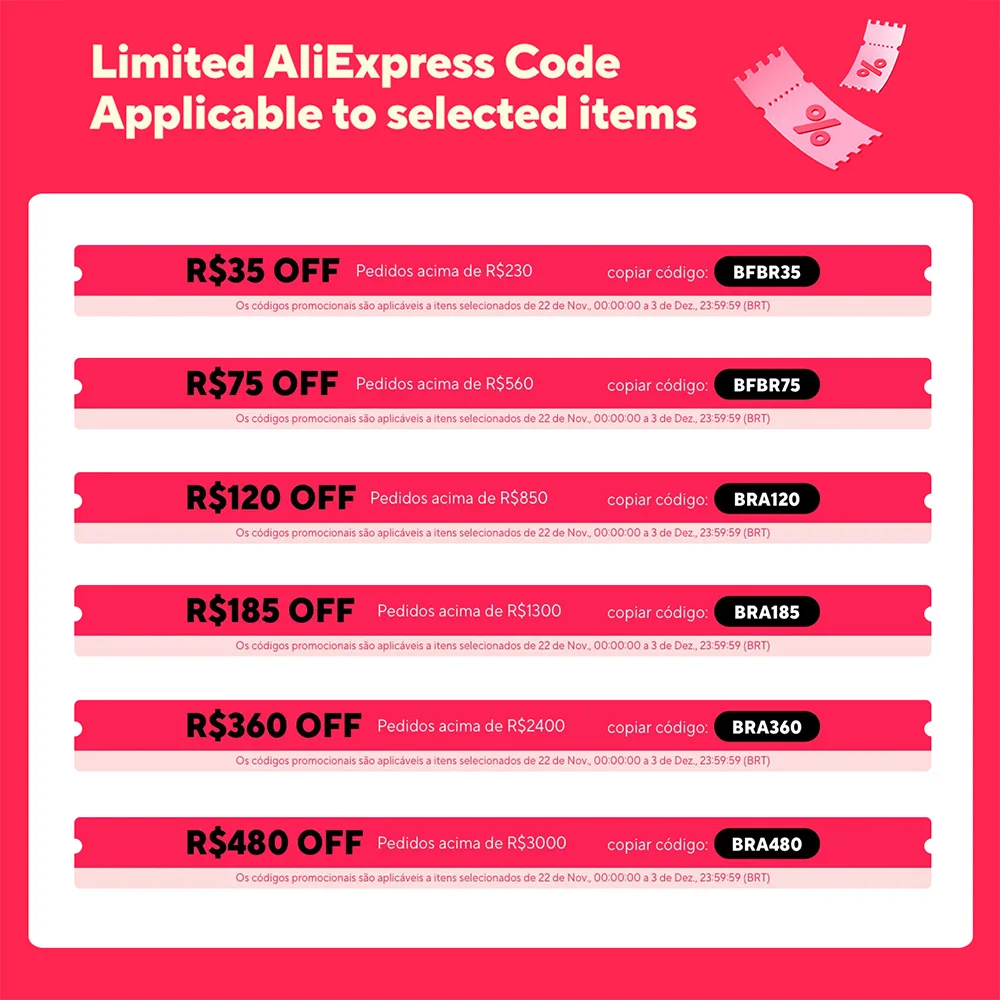 [Guia de benefícios da BR Black Friday]código de desconto de limiteR$230 R$35 BFBR35R$560 R$75 BFBR75R$850 R$120 BRA120R$1300 R$185 BRA185R$ 2400 R$ 360 BRA360R$3000 R$480 BRA480[Período efetivo]: 2024/11/21 horas:00-2024/12/03 18:59:59 PST; Horário do Brasil: 2024/11/22 00:00-2024/12/03 23:59:59:59 BRT[Lembrete caloroso]: A quantidade é limitada, primeiro a chegar, primeiro a ser servido!Específicos: